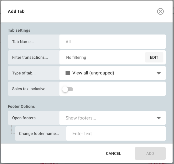 Tabs help you organise your view in Budgee. You can use them to show different sets of transactions, group information in different ways, or create dashboard-style summary views.